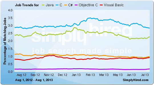 Yes, it is job trends time again! I am changing the list of languages a bit because I wanted to start including more languages. So, we are now up to 3 different posts just for languages. In Part 1, we look at Java, C++, C#, Objective C, and Visual Basic. I have decided to drop the “Traditional” label as most languages are used in various different scenarios, and traditional vs web was just a bad representation. Part 2 (PHP, Python, JavaScript, Ruby, and PERL) and Part 3 (Erlang, Groovy, Scala, Lisp, and Clojure) will be posted in the next few days as well.