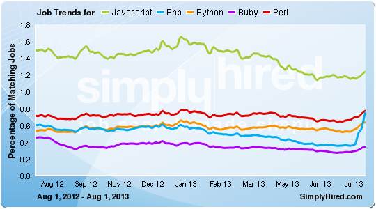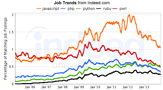 Given that overall percentage of jobs could be a misleading metric, the relative growth shows a different perspective. Ruby demand has obviously been increasing at a rapid rate, however that growth seems to have slowed a bit in 2013. Python shows solid growth, hovering at 500% since the middle of 2010. While you can’t really see accurate trends for the others, you can review the graph without Ruby. Perl is actually showing a purely negative trend for about 18 months. Javascript growth has slowed to about 50%, while PHP has dipped below 100%.